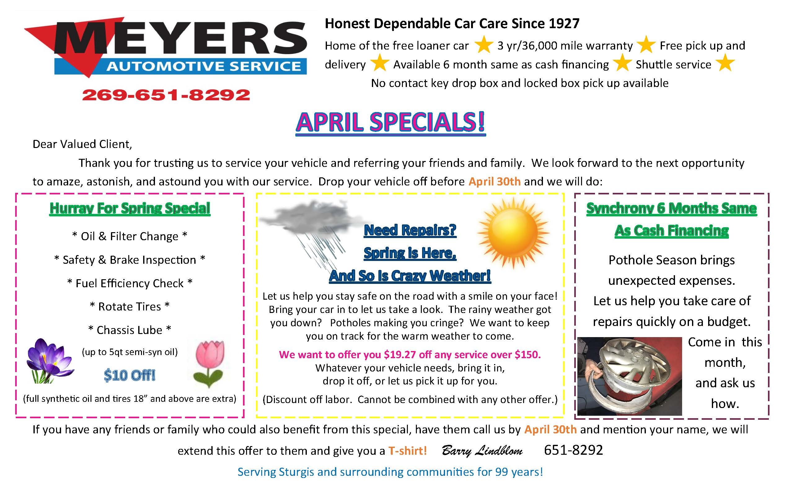 Our company has been repairing cars in Sturgis since 1927. We’ve built our reputation by being service oriented and delivering what we promise. We also ensure our customers understand exactly what we are doing with their vehicle, and why, by staying in good communication with them, as needed. We recommend regular maintenance and taking the time to get a basic understanding of your vehicle as the best way to avoid mechanical breakdowns. Have your brakes and tune up done on a regular basis. While you are here, I invite you to read a few testimonials from some of our many satisfied customers. And if you have questions about how we can help you with your vehicle, please call us today at (269) 651-8292. — Barry J. Lindblom, Owner.